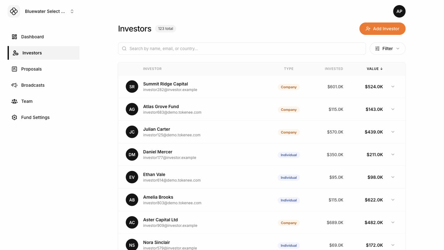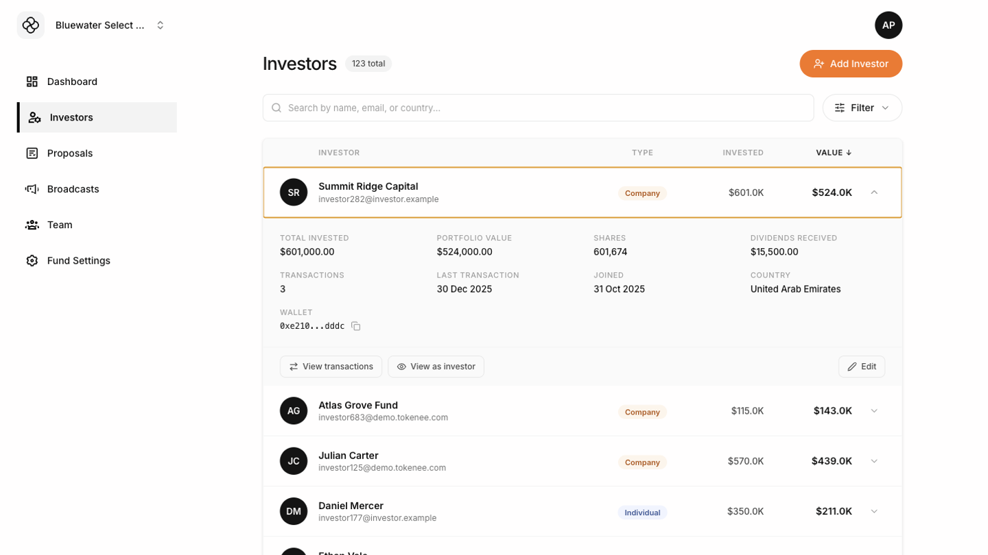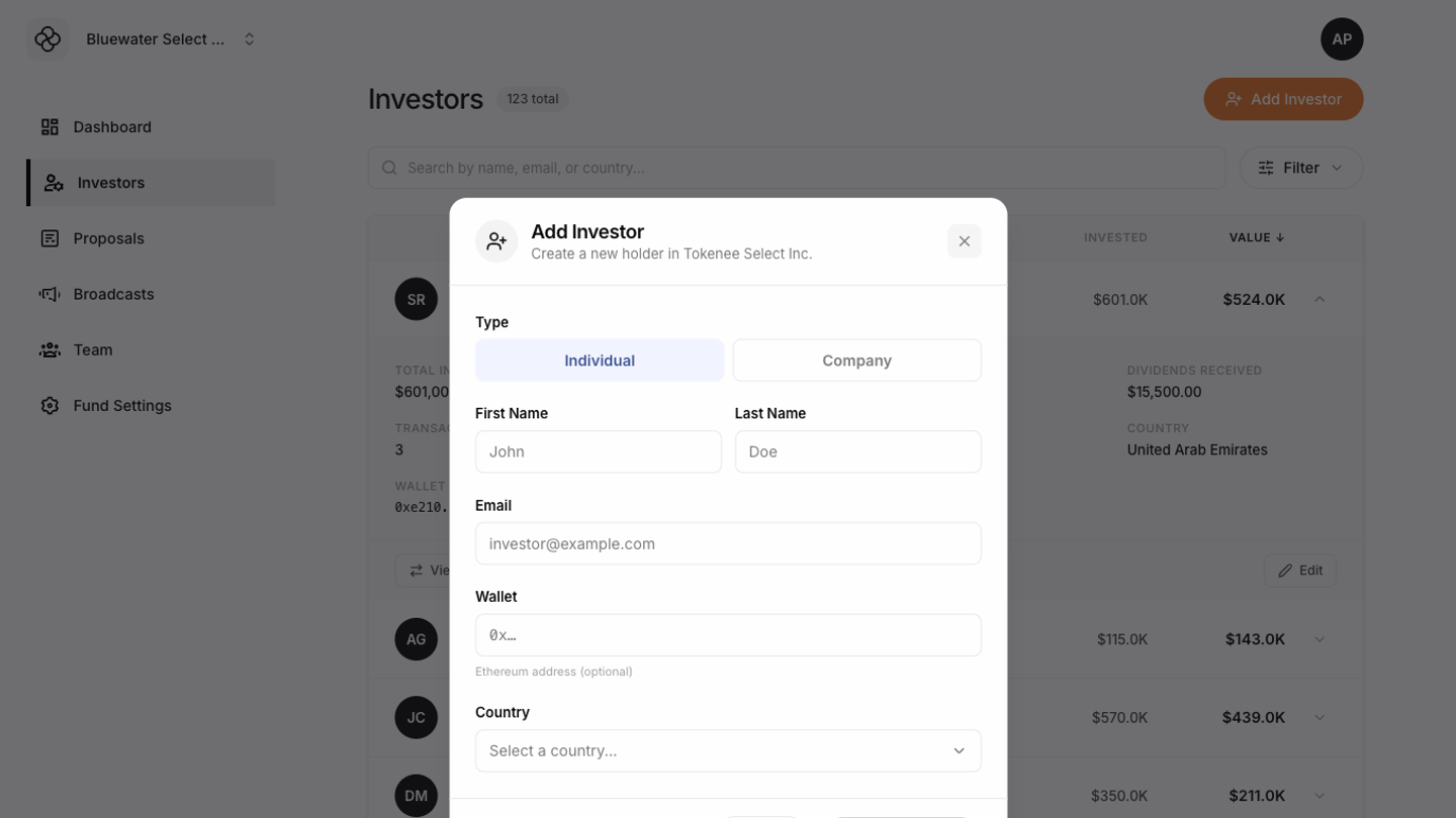 Use Add Investor to create a new holder record. Enter the investor details carefully, especially email and wallet information, because these fields affect login, records, and fund operations.