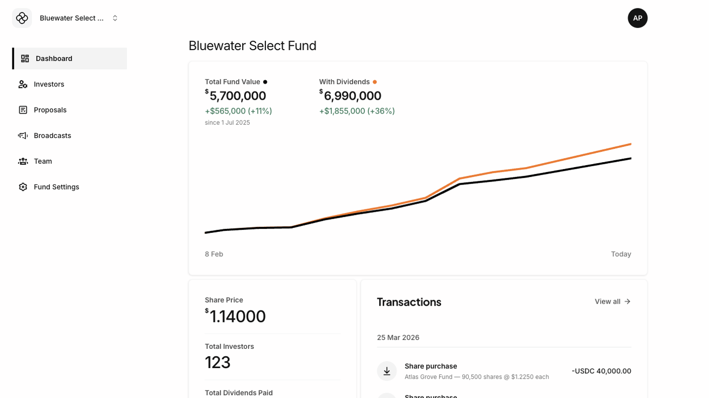 - Review fund value, share price, investor count, dividends, and recent transactions from the Dashboard.
