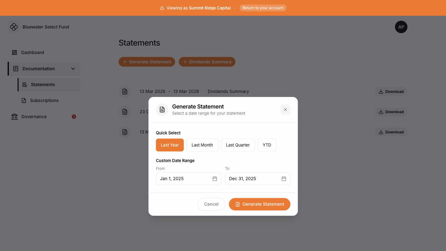 If your account has dividends, the Tokenee Fund Platform may also show a Dividends Summary option. Use it to generate a document focused on dividend activity. If you have no dividends, this option is hidden.Document history
